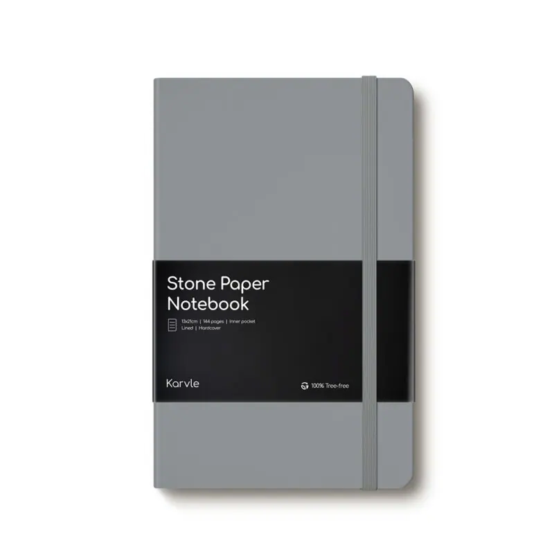Karvle’s ruled hardcover notebook in Graphite grey colour is made from durable, sustainable and recyclable stone paper and features a silky ribbon marker, elastic closure, an inner pocket and lay-flat binding. The hardcover on the exterior is crafted from vegan faux leather.